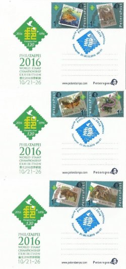 Петерспост. Россия. Всемирная филателистическая выставка PHILATAIPEI2016. Фауна стран Балтийского региона на почтовых марках. Серия из 3 карточек с серией из блока с гашением "Петерспост 21.10.2016 SPb-01" [PP16/PHILATAIPEI FDP]