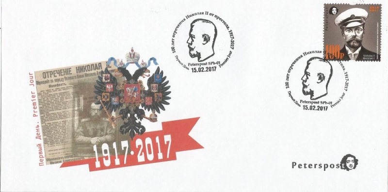 Петерспост. Россия. 100-летие отречения Российского Императора Николая II от престола. КПД с гашением "Peterspost SPb-01"